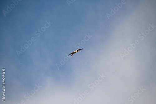 Obraz premium Storch fliegt und es ist leicht bewölkt