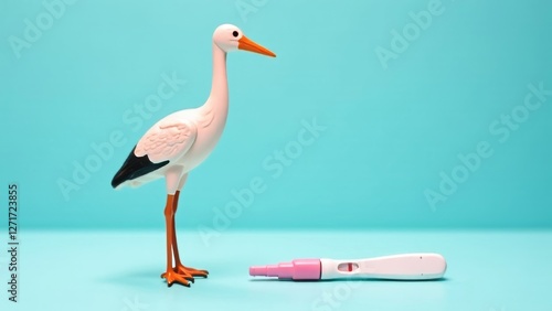 © Yulia Antonova, Obraz premium Stork figurine near negative pregnancy test, pastel background, copy space. Reproduction, conception, infertility treatment.