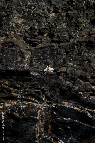 © PIC by Femke, Obraz premium stork nesting on cliffs with sea in the background