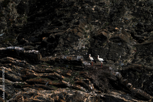 Obraz premium stork nesting on cliffs with sea in the background