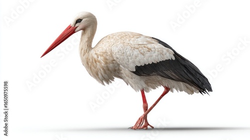 Fototapeta premium Stork standing in profile with long beak and legs, isolated against a white...