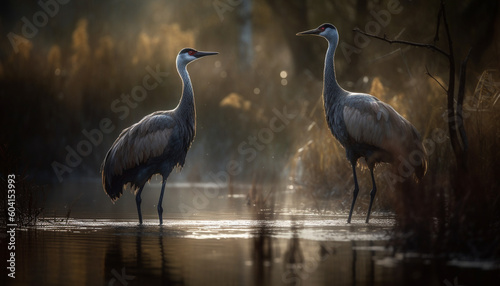 © Stockgiu, Fototapeta premium Stork standing in tranquil pond at sunset generated by AI