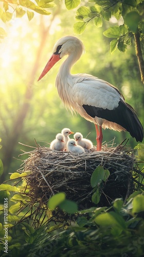 © Galaxyd, Fototapeta premium Stork with chicks in nest during sunrise.