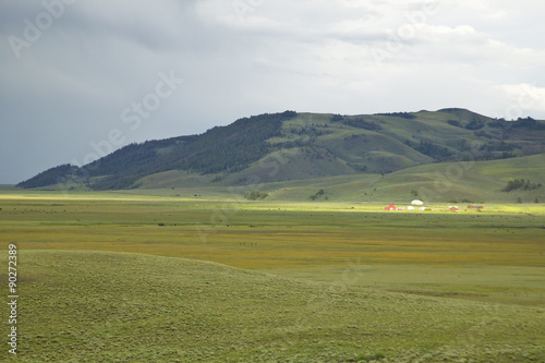 © spiritofamerica, Fototapeta premium Storm clouds and sunlight on farm in distance of Centennial Valley, MT