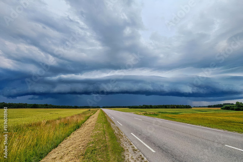 Fototapeta premium Storm clouds are gathering in a rural landscape with fields above an open road.