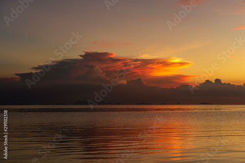 Naklejka premium Storm clouds during sunset.Colorful sunset over calm sea water near tropical beach. Summer vacation concept. Island Phangan, Thailand