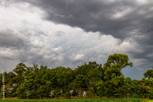 © david, Fototapeta premium storm clouds gather above treeline in late evening