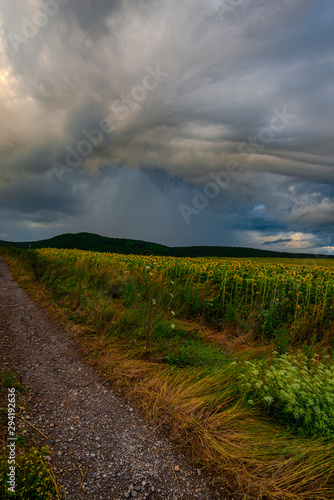 Obraz premium Storm clouds in the summer near sunflowers field