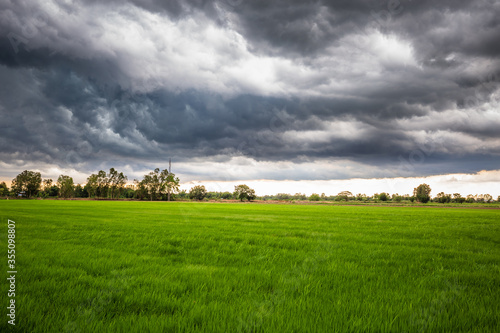 © patpitchaya, Obraz premium Storm Clouds Over Rice Field