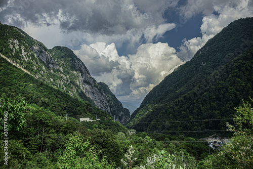 © Yulia, Obraz premium storm clouds over the green mountains trees