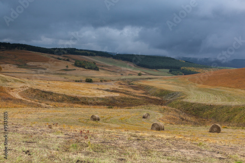 Fototapeta premium Storm clouds over the sloping meadows in the mountains.