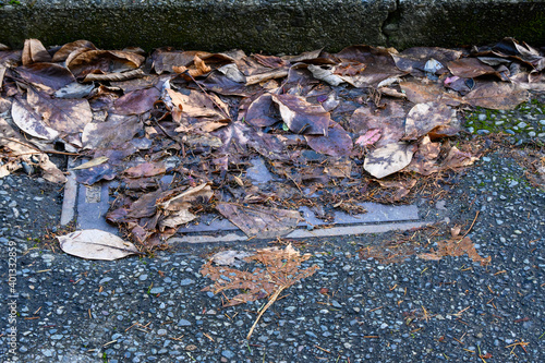 Obraz premium Storm drain covered in dead leaves, not ready for winter storms, residential street