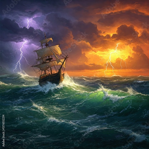 © Oleh, Obraz premium Stormbound Ship Illuminated By Lightning