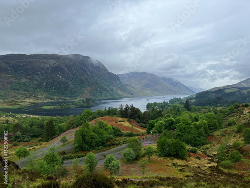 © Iuliia, Fototapeta premium Stormy and rainy weather over Loch Shiel in the Scottish Highlands, with a cloudy sky, lush greenery and mountains surrounding the beautiful lake. Glenfinnan, Scotland, UK.