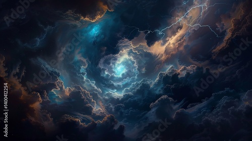 © Daxxt, Fototapeta premium Stormy celestial clouds swirling. Vast, swirling, cosmic clouds with lightning and light