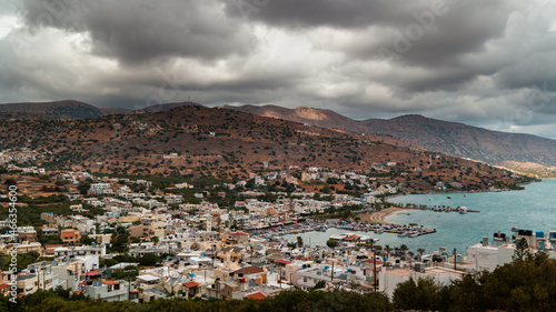 © whitcomberd, Fototapeta premium Stormy clouds and bands of rain over the Greek tourist resort town of Elounda on the island of Crete