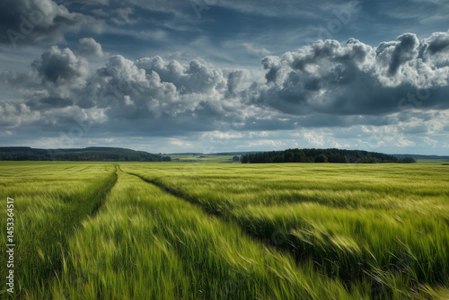 © Nature_Beauty, Fototapeta premium Stormy Clouds Over a Vast Green Field with Tire Tracks
