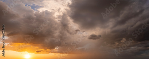 Obraz premium Stormy cumulonimbus clouds before thunderstorm on dark sunset sky. Moving and...