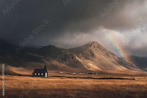 © Arnaud, Fototapeta premium Stormy Icelandic mountains with rainbow shining over black church in vast golden valley