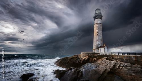 Fototapeta premium Stormy lighthouse by ocean with dark clouds