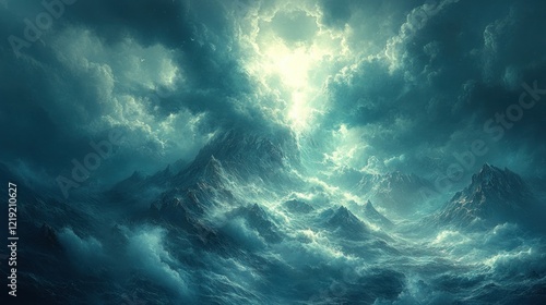 © adiar, Fototapeta premium Stormy Mountainscape Light Breaks Through Clouds