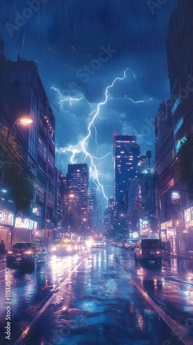 © QITIAN, Fototapeta premium Stormy night in the city with heavy rain and striking lightning illuminating the skyline.