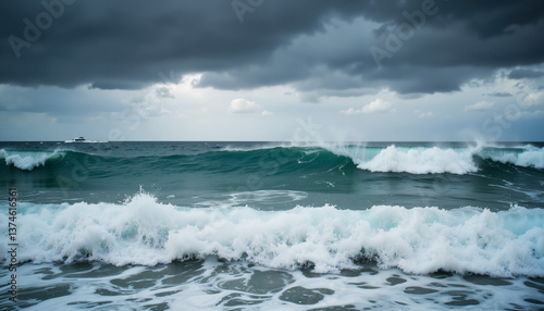 Fototapeta premium Stormy ocean waves crashing against a dark cloudy sky
