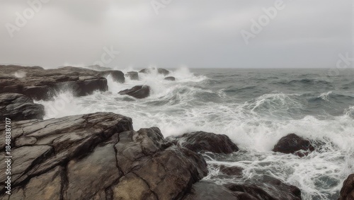 Fototapeta premium Stormy Ocean Waves Crashing on Rocky Shoreline Under Gray Sky.
