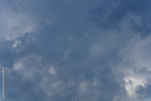 Fototapeta premium Stormy rain big fluffy clouds. Dark sky. Natural scenic abstract background. Weather changes backdrop. Sky filled with voluminous clouds.