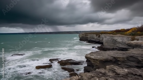 Obraz premium Stormy Sea Crashing Against Rocky Coastline