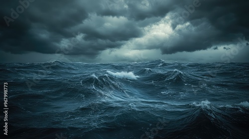 Fototapeta premium Stormy sea, the horizon barely visible under thick grey clouds in the midnight sky, with waves crashing in a moody, dramatic scene, sharp focus on water textures