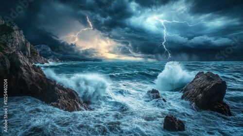 Obraz premium Stormy Sea with Dramatic Lightning and Waves