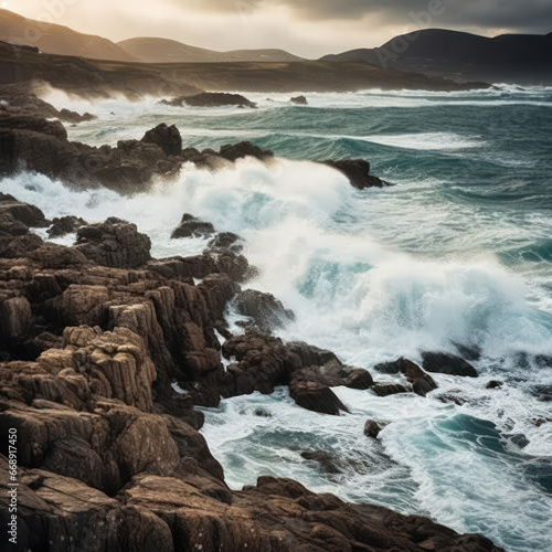 © Sekai, Fototapeta premium Stormy sea with waves crashing against a rugged