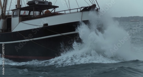 © Mountain, Naklejka premium Stormy seas engulf a vintage fishing boat
