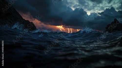 Naklejka premium Stormy Seascape, Dramatic Lightning, Rocky Coastline, Dusk