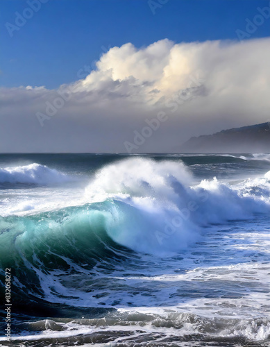 © Arda ALTAY, Fototapeta premium Stormy seascape, powerful waves crashing the sandy beach on the shoreline