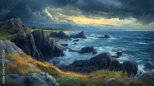 Fototapeta premium Stormy Seascape with Rugged Cliffs and Rolling Waves