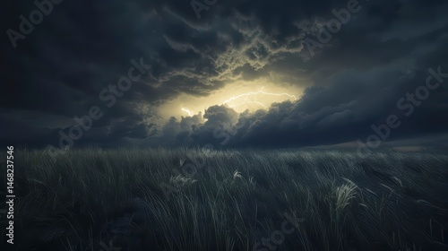© ABM, Fototapeta premium Stormy sky with a lightning bolt in the middle. The sky is dark and the lightning bolt is bright