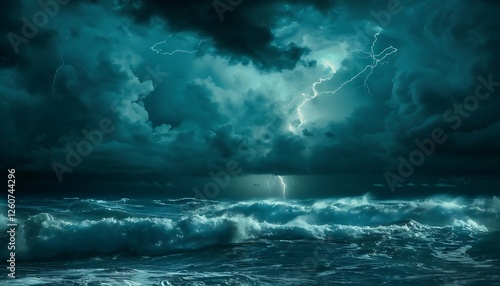 © Mahmud Creative, Fototapeta premium Stormy sky with lightning and sea waves. 3d illustration.