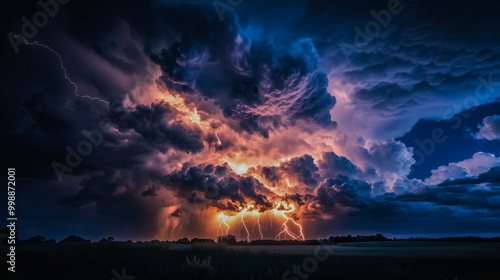 © panumas, Fototapeta premium Stormy sky with lightning bolts and dark clouds. Scene is intense and dramatic