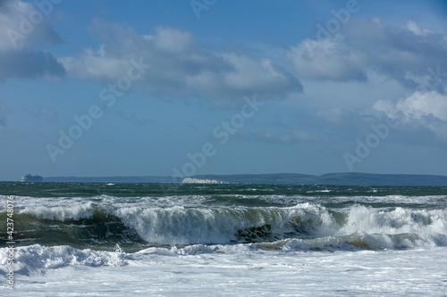 © Dolwolfian, Fototapeta premium Stormy weather at the beach with crashing waves under a majestic blue sky