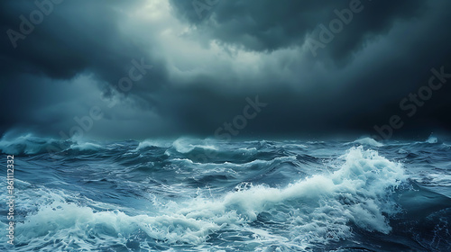 Fototapeta premium Stormy winds at sea, high waves, overcast sky