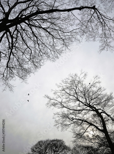 © chrisleeoz, Obraz premium Stormy winter cloudy sky seen through leafless trees and two crows fly overhead.
