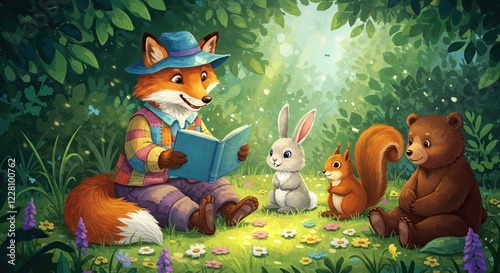 © ufuk, Fototapeta premium Story Time in the Forest Whimsical Illustration of Fox Reading to Animals.