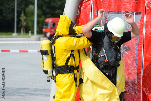 © benjaminnolte, Fototapeta premium Stosowanie materiałów niebezpiecznych przez straż pożarną