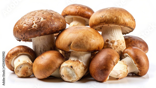 Fototapeta premium Stout porcini mushrooms with white background, Sunlight emphasizes their...