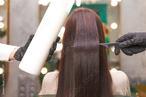 Naklejka premium Straight and shiny hair after lamination. Hairdresser demonstrates the result...