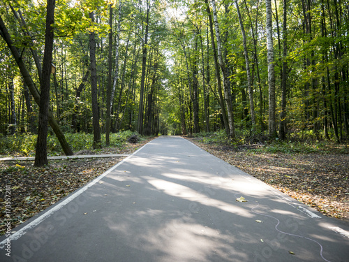 Fototapeta premium Straight asphalt alley with white line in park surrounded with trees