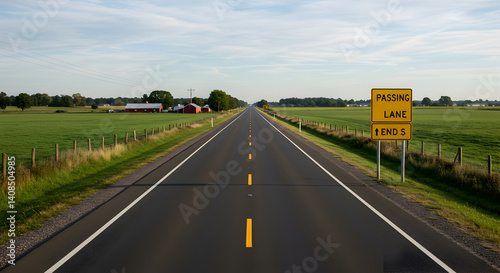 Fototapeta premium Straight Asphalt Country Road With Passing Lane Ends Sign In Midwest