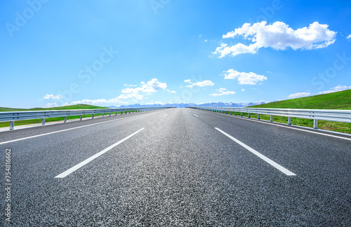 © ABCDstock, Fototapeta premium Straight asphalt road and green meadow with mountain nature landscape under blue sky